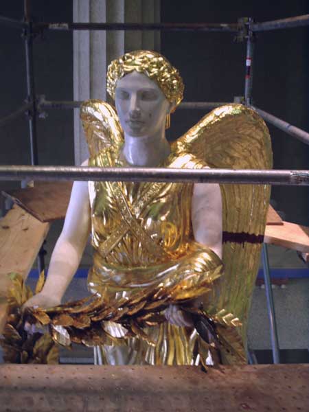 A picture of our lovely Nike, all shiny gold, holding a laurel leaf victory crown for Athena. The dark stripe on her wing is an area that needed to be regilded. These things happen... |